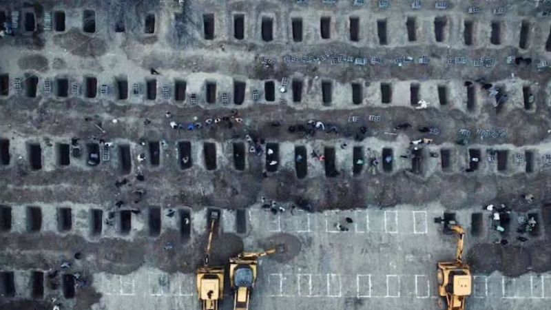 ಸ್ಮಶಾನದಲ್ಲಿ ಜೆಸಿಬಿಯಿಂದ ನೂರಾರು ಸ್ಮಾಶಾನ ಗುಂಡಿಗಳನ್ನು ತೆರೆಯಾಗಿತ್ತು. ಅದರ ಡ್ರೋನ್ ದೃಶ್ಯದ ಫೋಟೊವನ್ನು ಇರಾನ್ (Iran) ಹಂಚಿಕೊಂಡಿದೆ. ಗುಂಡಿ ಮುಂದೆ ಮೃತದೇಹ ಇಟ್ಟುಕೊಂಡು ಕುಟುಂಬಸ್ಥರು ಕಣ್ಣೀರಿಟ್ಟಿದ್ದಾರೆ. ಬಳಿಕ ಸಾಮೂಹಿಕ ಅಂತ್ಯಕ್ರಿಯೆ ನಡೆಸಿದ್ದಾರೆ.
